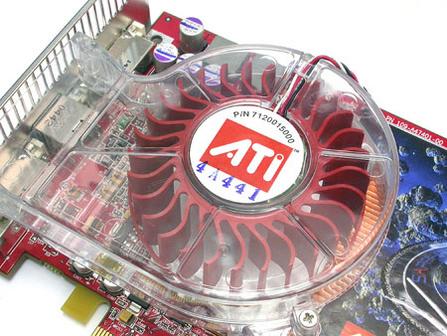 随着工作频率的进一步提升,Radeon X850XT PE的散热问题也变得更加严峻了。正是由于这个原因,这款显卡采用了A卡上从未使用过的双Slot散热器。这款散热器的底座和散热鳍片均为纯铜设计,核心和显存发出的热量通过它们首先被传递到全封闭的散热风道中,然后再通过强力的涡轮风扇直接排出机箱。这样作不仅保证了显卡自身的散热,同时还能够减小显卡热量对机箱内温度的影响。