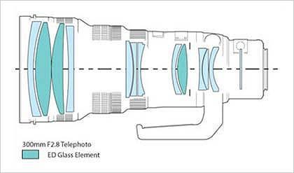 某品牌长焦镜头结构图,其中深蓝色的为ED(超低色散)镜片
