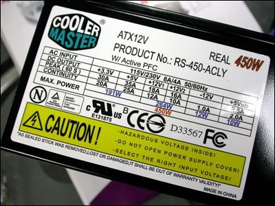 电源标识也标注的详细而专业。上面所说的450W,在这铭牌上也被写在了显眼处,它表示的是该产品的最大输出功率。