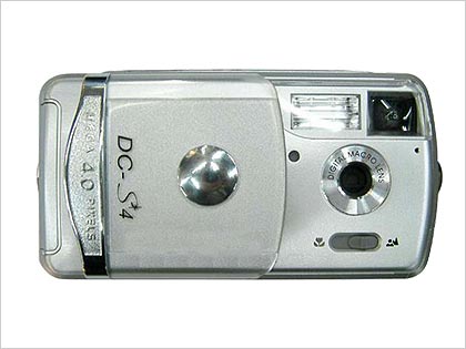 作为国产的拍得丽DC-S4数码相机,这款数码相机的体积非常小巧,外观看起来非常可爱,像一个亮闪闪的宝石夹,外观总体上来说显得时尚大方,但是机身的模具有点粗燥。机身大部分为塑料材质,配合着不多的按键有一种像一个玩具相机的感觉。从正面上看拍得丽DC-S4一半被金属外壳覆盖,另一半为塑料质地的滑动式镜头保护盖。在镜头保护盖上还有一个圆形的自拍镜,滑开拍得丽DC-S4正面的镜头保护盖,我们可以看到由上而下是闪光灯,取景器,镜头,微拍切换开关。看看机身的顶部,开关和快门键镶嵌在一条蓝色的装饰条里,与机身的色调十分协调。