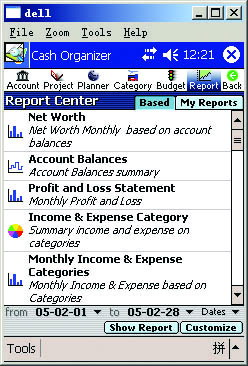 Cash Organizer Deluxe提供了非常多的自定义数据筛选和数据表达方式,如3D图表、辅助报告生成和附加信息等。在Cash Organizer中所有的数据都能很方便地与其它相关程序共享。你能将它的数据与Microsoft Money,Quicken等同步,也可以将QIF文件导入导出进行联机账目管理。你可将报表以BMP图片、网页、Pocket Excel、CSV格式保存,还可将Cash Organizer中的图和表拷贝到剪切板上,再粘贴到其它应用程序中,并且支持直接打印输出。
