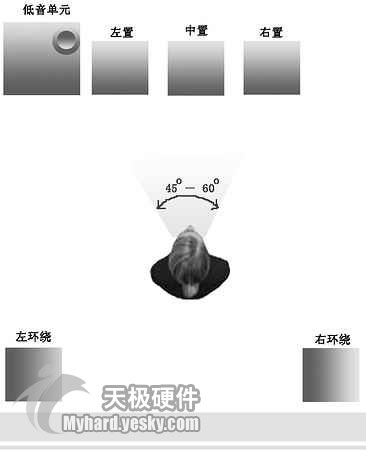 我们知道,5.1声道由于采用左L、中C、右?R、左后LS、右后 RS 5个方向输出声音,因此,能够更准确地进行声场还原,令人很容易就产生身临其境的感觉。这5个声道相互独立,另外的".1"声道则是一个专门设计的超低音声道,这一声道可以产生频响范围20Hz~120Hz的超低音,以增加气氛的烘托。跟4.1环绕系统相比,5.1声道主要是增加了一个中置单元。在这里提醒一下,目前市场上的某些声称支持多声道的声卡只是将原有的二声道讯号复制一份而成为后方二声道而已。如此一来,前方与后方的声音都是相同的,因此并非真正意义上的多声道。大家在选购当中,要千万小心此类假冒的5.1音箱。