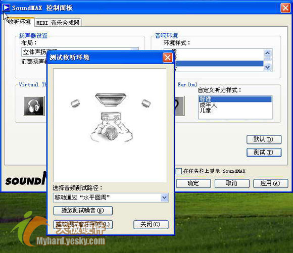 小提示:目前声卡驱动控制面板中往往提供了音场测试功能,大家可以利用此功能来测试5.1音箱的真伪。当然声卡必须支持6声道以上输出功能的!