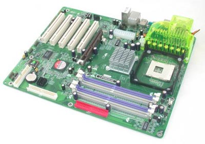 这款产品使用了绿色的PCB,做工没的说,大量的铝壳电容拥有超长的使用寿命,简洁整齐的布线也是这款主板华丽所在。它的性能,功能表面看上去并不输于865等芯片。拥有4个PCI接口,一个AGP接口,一组双通道内存接口,两个SATA接口并支持RAID功能。外部接口到是比较简洁与前面诸多产品相比它只能自惭形秽。