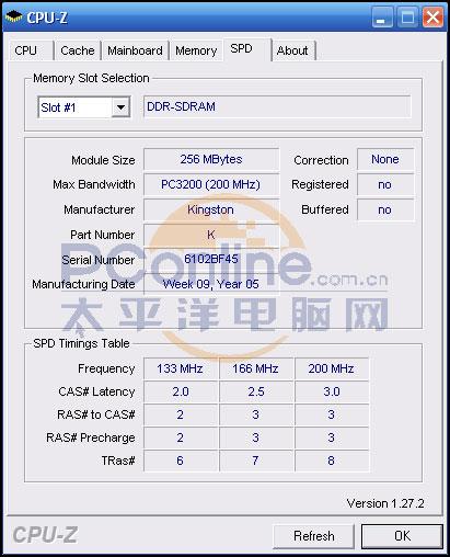 Kingston DDR 400的参数较为保守,200MHz时只是标准的3-3-3-8而已,生产日期是2005年的第九周。
