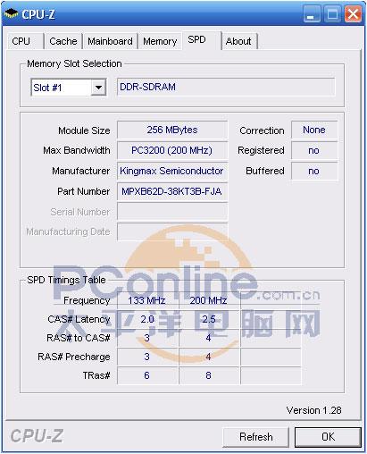 KINGMAX 胜创 DDR400采用的芯片编号是KDL388PA4LA-50,是标准的DDR 400颗粒,但在芯片上与CPU-Z中我们都无法识别该内存的生产日期。