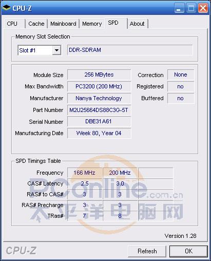 不愧为南亚原厂内存,在CPU-Z中我们可以看到提供的信息是十分完整的,不过生产日期的Week80,Year04却又让人费解,因为一年是没有80个周的。默认的时序参数为3-3-3-8。