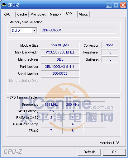 用CPU-Z查看可以大概知道这是2004年37周的产品,默认的参数是DDR 400标准的3-4-4-8。