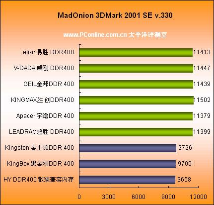 众所周知,3DMark 2001SE得分对CPU及内存性能较为依赖,所以不同的内存性能可以在结果中很直观地体现出来。在NF2 ULTRA400芯片的主板配合AMD Barton 2500+ OC Barton 3200+的平台上, 各品牌内存之间的距离并不大。而在AMD Athlon 64 3200+配合NF4 Ultra主板平台上Gelexy 影驰6600GE (Geforce 6600 400/800MHz) PCI-Express X16这类型的中高高端显卡时,内存之间的差距就显而易见了,得分最高的Apacer DDR400比GEIL DDR400得分要高出500分以上。