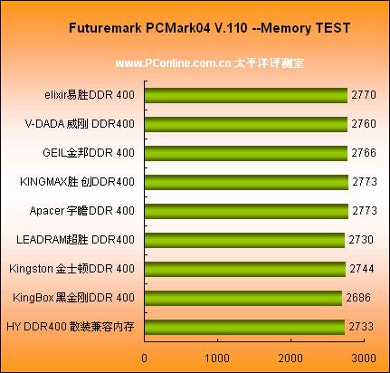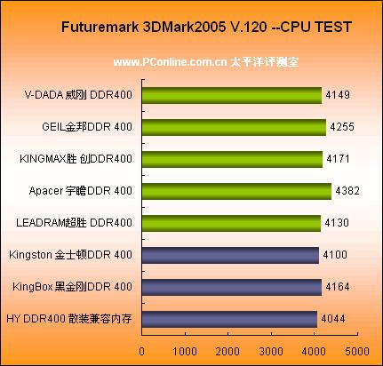 Futuremark 3DMark2005 V.120 --CPU TEST虽然主要是面对CPU的测试,不过内存性能的优劣明显会影响其得分情况,Apacer DDR 400明显要较为优秀一点,GEIL 金邦DDR 400则屈居二位。