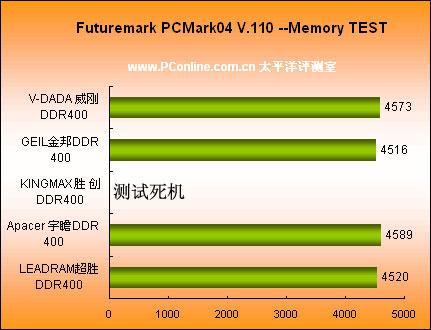 不过在NF4 ULATRA上,KINGMAX DDR400则在多次测试中死机。其他品牌则得分都在4500与4600的幅度之间排列。