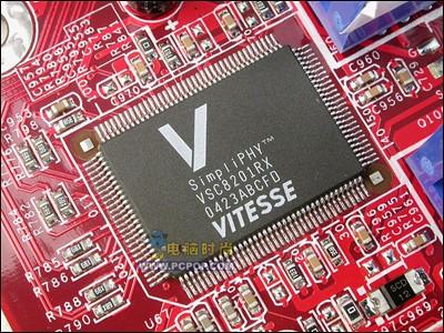 主板中板载了一颗Vitesse的VSC8201RX PHY芯片,配合nForce3 250Gb内部集成的千兆以太网控制功能,主板可以实现对10/100/1000Mbps自适应以太网的支持,而且其提供的防火墙功能,还能起到防止黑客入侵、保护用户终端的作用。