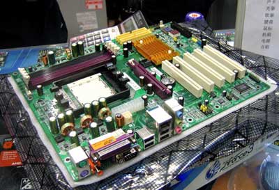此外大家留意的话,磐正主板芯片组上,一般都加了一金黄色的散热片(或风扇),除可有效改善芯片散热问题的同时,更已经成为磐正主板的一大标志了。三相供电回路设计以及高品质三洋电容能够保证高性能AMD64处理器的运行稳定。