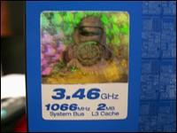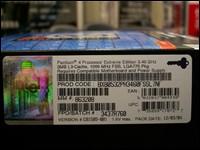 这款P4EE 3.46GHz CPU包装较以前的传统P4包装有所不同,放弃了P4惯用的蓝、橙色调,而是采用蓝、黑色调相搭配的包装盒,让人眼前一亮,同时也体现了P4EE与传统P4处理器的区别。包装盒上仍然有Intel独特的激光防伪标识,技术参数也比较详细,包括处理器的名称、频率、缓存大小、总线速度、步进号以及产地等信息,方便了用户的识别。