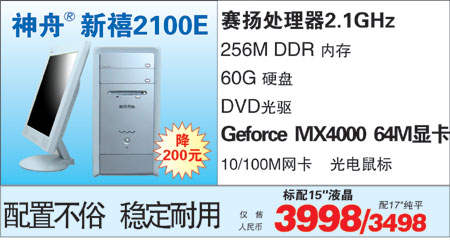 神舟一向被称为品牌机市场的价格杀手。这款新禧2100E即具备了这样的品质。其具体配置为:Intel 赛扬4 2.1G处理器、256M DDR内存、60G硬盘、DVD光驱、GeForce MX4000 64M独立显卡、15寸液晶显示器。