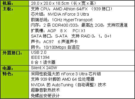 浩鑫是PC机型准系统的发起厂商,可以说准系统风潮的兴起离不开浩鑫XPC系列准系统的的功劳。这款浩鑫 SN95G5采用了全黑色的外观设计,整体看来比较酷黑。支持AMD 64位处理器的迷你准系统。它搭配了最为强大的NVIDIA NForce3 Ultra芯片组,支持AMD Athlon 64/FX (Socket 939)处理器,让AMD 64位处理器在前端总线高达1GHz Hypertransport的总线配合下,其强大的运算处理能力得以完全发挥,高速I/O通道数据传输,大大提升系统的整体性能。此外配合双通道的DDR400 和SATA接口,使得数据的读取更加流畅。NVIDIA nForce3 Ultra MCP 还拥有 NVIDIA 的AutoTuning(自动调整)技术。NVIDIA nForce3 MCP中的这个新特性可以自动的将PC的时钟频率调节到最佳,从而使你的系统表现实现最优化。加上浩鑫自主研发的超静音散热技术(Silent X Technology),使CPU散发出来的热能迅速排出机箱,使系统运行稳定!
