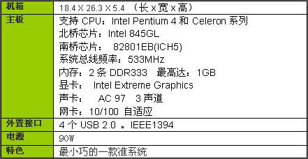 艾崴ZPC是目前市面上最小巧的一款准系统,整个系统使用了Intel845GL芯片组。DDR266的内存,ATA100的硬盘接口。板载集成了VIA6306火线芯片,及 Realtek650AC97音效芯片和RT8100B的10/100m网卡芯片。虽然ZPC没有好大的升级能力,但是能够将众多的电脑配件整合在只有184×263×54mm的空间内,足以可见艾崴在准系统制造行业的水平。它整个机身通体洁白,非常小巧,在上面板和下面板的安装了两块透明塑料和两个强大的散热口。在前面板上,可以看到光驱口、USB、IEEE1394、音频输入输出等常用接口。再配置一台17 英寸的液晶显示器,摆设在家中最显眼的地方,肯定能够吸引客人的目光。