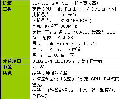 DTK DEFT-865G采用Intel 865G芯片组+ICH5主板,支持支持3GHz以上的800MHz前端总线的Pentium4和Celeron处理器。从外观上DTK提供了五种颜色可选择,分别是银/蓝/红/金/黑,深受学生族的喜爱。主板采用深蓝色PCB板,做工精细。板载了支持独立显卡的AGP8X插槽,两个双通道DDR内存槽最高达2GB。内部设计的也十分合理,一个大风扇为整个板面提供强大散热功能,而且热风直接从机箱尾部散出。在机身两边还各有一个散热孔群,帮助散热。前置的系统控制面板可以监测和设定CPU和系统的温度,它提供了3种智能模式:正常,静止和模糊。这款PC机型准系统目前售价只有1488元,其性价比相当高,非常适合学生购买。