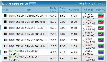 就拿中关村的电子市场来说吧,除了最受人关注的DC、DV等数码产品热销外,DIY攒机产品也颇受青睐。纵观各大电子配件,内存无疑是重点之一,内存商家们也都在摩拳擦掌。在前段时间内存产品大幅降价后,尽管有些回涨,但是从国际市场和五一假期两大因素影响来看,内存整体价格已经回稳,因此,近期依旧是非常值得购买。