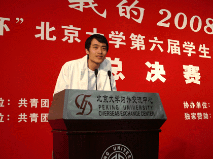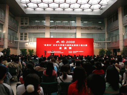 随后,来自北京大学校本部各院系和医学部、应用文理学院的18名选手陆续闪亮登场。他们都是经过激烈的初赛、复赛,从近300名报名选手中选拔出来的优秀选手,代表了北京大学学生演讲的最高水平。比赛中,选手演讲风格多样:或豪情万丈,催人奋进;或深情款款,感人至深;或幽默风趣,寓庄于谐;或见解独到,让人耳目一新。其演讲话题的涵盖范围也相当广泛,从对校内生活的感悟到对社会现象的思索,从08奥运到北大110年发展,体现了北大学子对自己、对北大、对祖国的理性思考和“身在校园,心忧天下”的胸怀。
