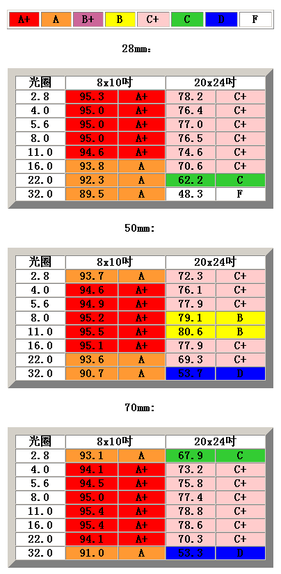 SQF值显示该镜头影像质量在所有光圈下均很好。20mm处为可察觉的桶型畸变(1.5%),50mm处为可察觉的枕型畸变(2.0%),70mm处为不小的枕型畸变(2.47%)。28mm处胶平面曝光精确,f/2.8至f/8时1/5欠曝,f/11至f/16时1/3档欠曝,f/22时1/2欠曝,f/32时2/3档欠曝。70mm处胶平面曝光很精确,最大光圈时由于四周光量下降呈2/5档欠曝,f/4至f/16时小于1/10档欠曝,f/22时1/3档欠曝,f/32时1/2档欠曝。