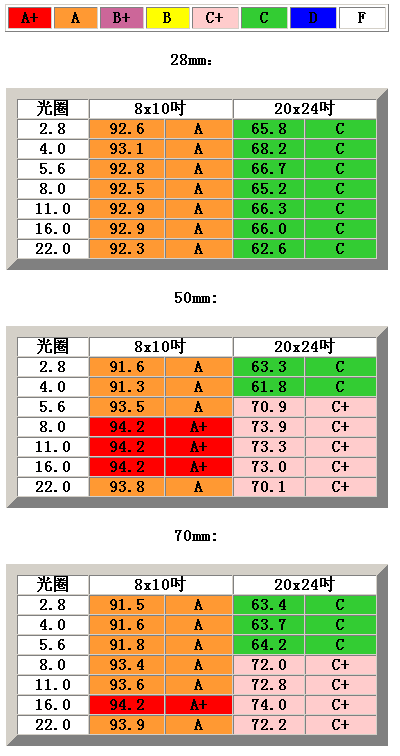 SQF值显示该镜头28mm和50mm处表现很好,70mm处表现好。28mm处有可察觉的桶型畸变(1.69%),50mm和70mm处为可察觉的枕型畸变(分别为1.28%和1.50%)。28mm处胶平面曝光精确,f/2.8至f/8时1/5档欠曝,f/11至f/16时1/3档,f/22时1/2档,f/32时2/3档,70mm处胶平面曝光很精确,最大光圈时由于四周光量下降呈2/5档欠曝,f/4至f/16时小于1/10档,f/22时1/3档,f/32时1/2档。28mm处的实际最近对焦距离为68厘米,此时放大率为1:20.8,中央锐度所有光圈下极佳,边缘锐度f/2.8时差,f/4时可接受,f/5.6时好,f/8至f/16时极佳,f/22时好,最佳光圈为f/11。50mm处的实际最近对焦距离为66厘米,此时放大率为1:11.2,中央锐度f/2.8至f/8时可接受,f/11时好,f/16至f/22时很好,边缘锐度f/2.8时差,f/4时很好,f/5.6至f/16时极佳,f/22时很好,最佳光圈为f/16。70mm处的实际最近对焦距离为64厘米,此时放大率为1:8.2,中央锐度f/2.8至f/8时差,f/11时可接受,f/16至f/22时很好,边缘锐度f/2.8时差,f/4时好,f/5.6时很好,f/8至f/16时极佳,f/22时很好,最佳光圈为f/16。