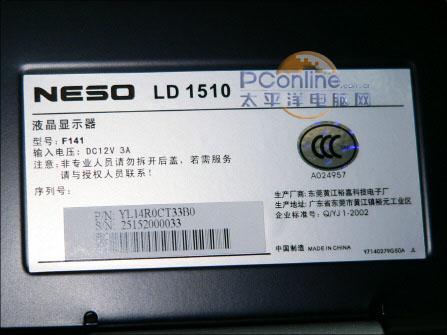 然而我们从显示器背面板产品标识处能够看到,NESO LD1510另一个型号为F141,这应该才是这款14.6英液晶显示器的真实型号,而LD1510则有些混淆视听之嫌。另外从生产地址还能知道,这款产品是在东莞出厂的。