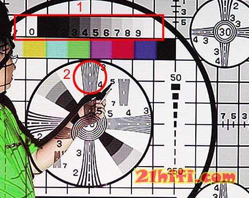 此为解析度测量表 MONOSCOPE,可测试出影像的灰阶表现 (圈 1)、水平解析度 (圈 2)。