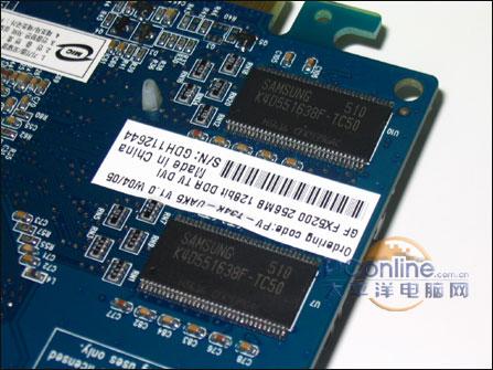 Samsung 5ns TSOP封装显存运行在400Mhz,刚好可以满足FX5200显卡的显存频率需要,并没有为玩家预留很大超频空间。不过Samsung TSOP封装向来拥有不错的超频能力,大家不妨也小超一把。