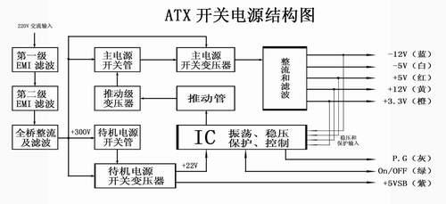 但我们同时注意到,300V直流电加到待机电源开关管和待机电源开关变压器后,由于待机电源开关管被设计成自激式振荡方式,待机电源开关管立即开始工作,在待机电源开关变压器的次级上输出二组交流电压,经整流滤波后,输出+5VSB和+22V电压,+22V电压是专门为IC供电的。+5VSB加到主板上作为待机电压。当用户按动机箱的Power on启动按键后,(绿)色线处于低电平,IC内部的振荡电路立即启动,产生脉冲信号,经推动管放大后,脉冲信号经推动变压器加到主开关管的基极,使主开关管工作在高频开关状态。主开关变压器输出各组电压,经整流和滤波后得到各组直流电压,输出到主板。但此时主板上的CPU仍未启动,必须等+5V的电压从零上升到95%后,IC检测到+5V上升到4.75V时,IC发出P.G信号,使CPU启动,电脑正常工作。当用户关机时,绿色线处于高电平,IC内部立即停止振荡,主开关管因没有脉冲信号而停止工作。-12至+3.3的各组电压降至为零。电源处于待机状态。