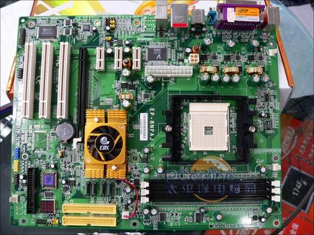 磐正 EP-8NPAJ是本次导购中唯一一款高于700元的产品,但是它采用的主板芯片也是最好的,nVidia nForce4-4X芯片使得这款主板支持PCI-Express接口,在上面的图片中我们可以清晰地看到3个PCI-E X1插槽和1个PCI-E X16插槽。