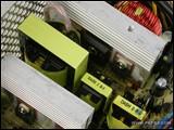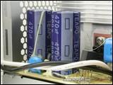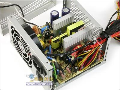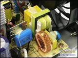 一级和二级EMI电路都做在PCB板上,被动PFC电路的个头很大,固定在电源的外壳上。两颗高压滤波电容的规格均为470μF 200W,变压器的个头也非常大,低压滤波部分用料相当足,做工也不错。采用8025的风扇也能及时地将电源产生的热量带走。