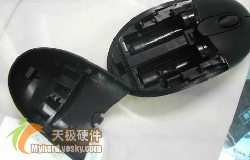 电池仓采用了类似以往的LOGITECH标准小型鼠标的设计,打开鼠标的背板滑盖安放电池。这种设计节省了空间同样也降低了重新设计PCB的成本。但是也有好处,可以突出鼠标的流线感,看上去背板的滑盖与鼠标浑然一体。