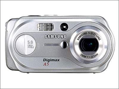 三星Digimax A5搭载了1/1.8英寸500万像素的CCD感光元件,最大支持2592*1944分辨率的图片,3倍光学变焦、4倍数码变焦镜头,焦距相当于传统相机的38mm-114mm,A5提供光圈优先、快门优先、手动曝光等功能。其中快门速度和光圈用专门的转盘按钮来控制,非常方便,三星Digimax A5可支持 Memory Stick Duo 、SD Card和 MMC Card,兼容9种不同的电源。目前它的售价为1880元,与上面提到的尼康5100相差无几,不过样子看上去会比5100时尚一些。
