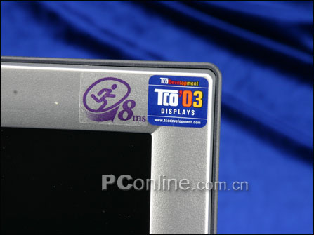显示器的右上角的TCO'03认证标记。8ms极速响应时间,可以实现每秒125帧的画面,使得液晶显示器在玩游戏或播放动态影像时更加流畅自如,彻底挥别响应时间的桎梏,呈现完美的影像品质,能为用户带来更加完美的动态视频享受。