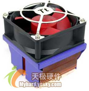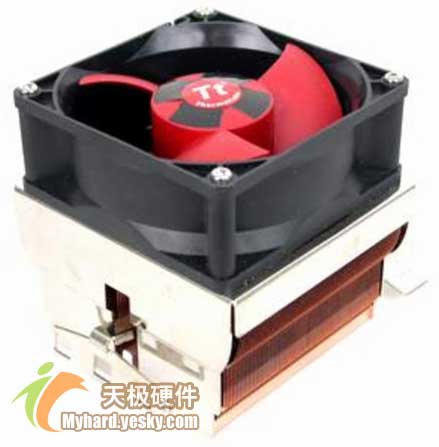 该散热器采用了纯铜材质的散热片,采用了回流焊接技术,将70多叶铜鳍片固定在上面,搭配8025风扇。该散热器采用了双滚珠轴承风扇,其转速为5000转/分,标称工作噪音为26.5dBA。散热器的尺寸为73.6mm×73mm×48mm,能够支持全系列K8处理器。该散热器配备有两个风扇调速器,可以安装在3.5英寸面板和PCI挡板上。另外,还有一个感温探头,可以一端连接在风扇上,一端放在尽量靠近CPU的地方,风扇会根据感温探头附近的温度自动控制转速。