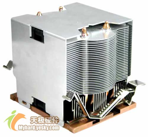 该散热器采用了双热管加整体风道设计,散热片内镶进了两根U形的热管,具有极高的导热能力,使散热器的性能更加强劲。纯铜散热底部设计,则具备了吸热迅速和散热高效的特点。该散热器既可以支持Intel平台的P4处理器又可以支持AMD平台的K8处理器。其风扇采用了单滚珠液压轴承,转速为4000转/分,标称工作噪音为32dBA,散热器的尺寸为83mm×89mm×93mm。通过附送的底座,使得散热器能够兼容Socket478和Scoket754/939多平台,方便用户使用。