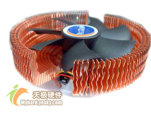该散热器采用了放射型的全铜散热片加一个无框的巨型风扇设计,风扇口径非常大。风扇与散热片的安装结构为嵌入式,通过两颗螺丝固定在底座铝块上面,然后被散热片包围起来。该散热器既可以支持Intel平台的P4处理器又可以支持AMD平台的K8处理器。其风扇采用单滚珠液压轴承,转速为2200转/分,标称工作噪音为25dBA,散热器的尺寸为138.5mm×136.4mm×65mm。该散热器附带一个调速器,通过串接可调电阻来控制风扇的电压,以此来调整风扇的转速。