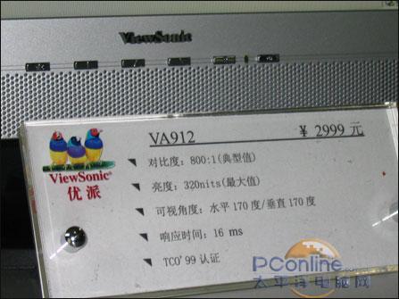 优派 VIEWSONIC 是显示器里面的一线品牌,同等规格的产品在市场上往往要比其他牌子稍贵一些,但是优派这款19寸的LCD VA912 竟然破天荒一上市就卖2999元,性价比非常高。