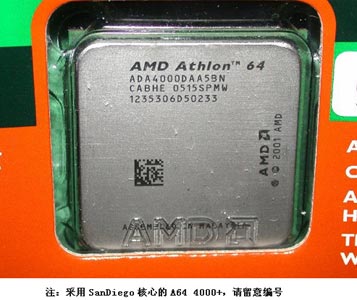 为了与采用CG步进ClawHammer核心的Athlon 64处理器区分开来,基于SanDiego核心的Athlon 64处理器的编号也有改变:在处理器封装盖上,如果编号最后的两个字母是“BN”的,就暗示这是采用SanDiego核心(E4核心)。