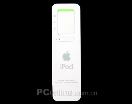 iPod shuffle的外观除传承APPLE一贯的简单洁白且极富艺术气息外,更有一种单纯得近乎青涩的纯洁气质。长条形圆角、有棱有角的边缘、面板上圆形的组合按键,完全继承了iPod的经典风格。特别是推下三段式开关后露出的一抹绿色,看似不经意,其实极富用心,整个外观也因为这抹绿色变得生动、富有深意。