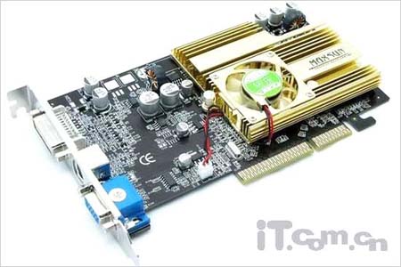 狂镭9600Pro采用了铭?一贯金黄色散热器,散热片覆盖了整个核心及显存部分,为显卡提供出色的系统散热。在显存方面,采用了正反各4颗的三星3.3ns TSOP DDR显存颗粒,默认频率为600MHz。虽然此款显卡的的超频空间并不大,但是它自身的性能也已经远远高出RADEON 9550许多。