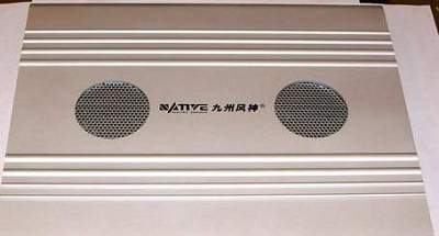 九州风神SNOWMAN S90 一款国内品牌的笔记本散热器,这款产品采用了双风扇加铝合金机身设计,而风扇采用吸风设计,并且风扇两侧设计了略高于散热片的棱。如果本本放在这款散热器上,那么在散热器风扇工作的时候,气流就会从机身四面流入风扇,从而更迅速带走机身热量。这款产品价格大约在300元左右。