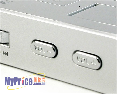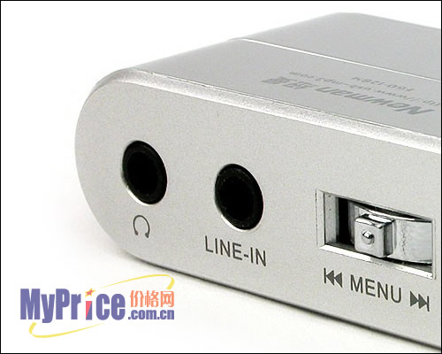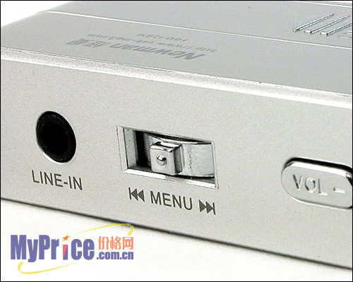 机身共设计有耳机输出插口和LINE IN直录输入口两个接口;另外,除了单独的音量控制键,还设计有一个小巧的“MENU”控制杆,位于LINE IN的右方,它的功能较为全面,可实现音乐播放、收音、录音三种模式下的快速切换。