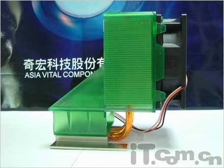 既然CPU这么能超,好的散热器当然少不了。这一款龙骑士II散热器产品就是老牌散热器厂商奇宏科技AVC所推出的用于Intel Prescott处理器的热管散热器。采用了现在相当流行的侧进风方式和滚珠轴承风扇。与龙骑士不同的是龙骑士II没有再配备龙骑士5000RPM的风扇,采用了AVC原厂新型低转速风扇,再保证同样大小送风量的前提下有效的降低了噪音问题。