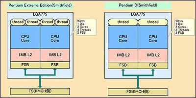 图3:基于Smithfield衍生出的奔腾至尊版和奔腾D,主要区别就在于奔腾至尊版支持超线程,而奔腾D屏蔽了超线程功能