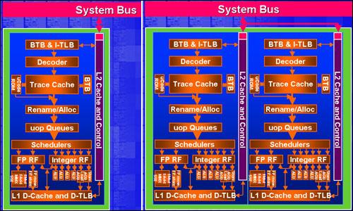图4:单核奔腾4处理器(左)和双核奔腾D处理器(右)微架构示意图