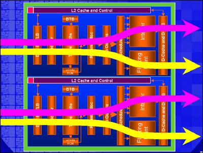 此外,英特尔奔腾至尊版有一个独门“绝活”,那就是双核心加超线程的架构,这种架构可同时处理四个线程,这让它在多任务多线程的应用中具有明显优势。而且CMP与SMT(同时多线程,英特尔超线程就是一种SMT技术)的结合是业界公认的处理器重要发展趋势,最早推出双核处理器的IBM也是这一趋势的推动者。