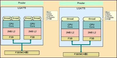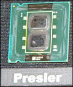 Presler将集成两个独享2MB二级缓存(2x2MB)的处理器核心,由Smithfield演变出的奔腾至尊版和奔腾D均为每个核心独享各自的1MB二级缓存(2x1MB),采用65纳米工艺制造,不过Presler的两个核心将分别刻蚀在两个DIE上,再统一封装在一个处理器基板上。这种方式可以避免目前将两个处理器核心刻蚀在一个DIE上可能引发的一个核心存在瑕疵连累另一核心也不得不报废的情况,更加有利于节省制造成本。Presler仍将使用LGA 775封装,可与945和955系列芯片组搭配使用。
