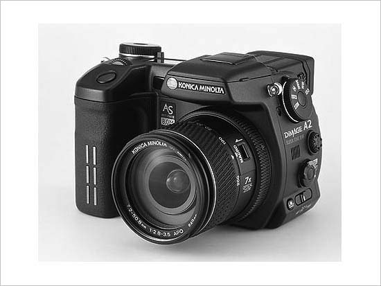 柯尼卡美能达A2采用的是800万像素2/3英寸逐行原色CCD,具有防震系统可使用户在使用时能够获得良好的抗抖动效果,镜头采用著名的是柯尼卡美能达GT镜头,具有超大口径和7倍光学变焦能力,焦距为7.2-50.8mm,最大光圈值为F2.8-F3.5,快门速度范围30 秒-1/4000秒,可录制544×408像素、30幅/秒、带录音的动画,支持全手动功能。该机背面EVF的像素达到了92.2万,LCD液晶屏虽然只有1.8英寸11.4万像素,但可以拉出作90度角调整,便于低位拍摄。存储方面,CF卡依然是800万旗舰机的一致选择,随机配备1块NP-400锂离子电池。